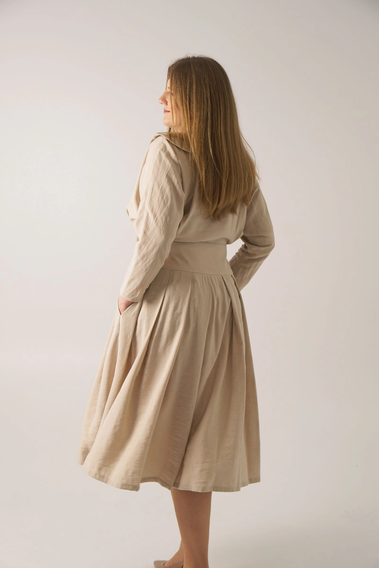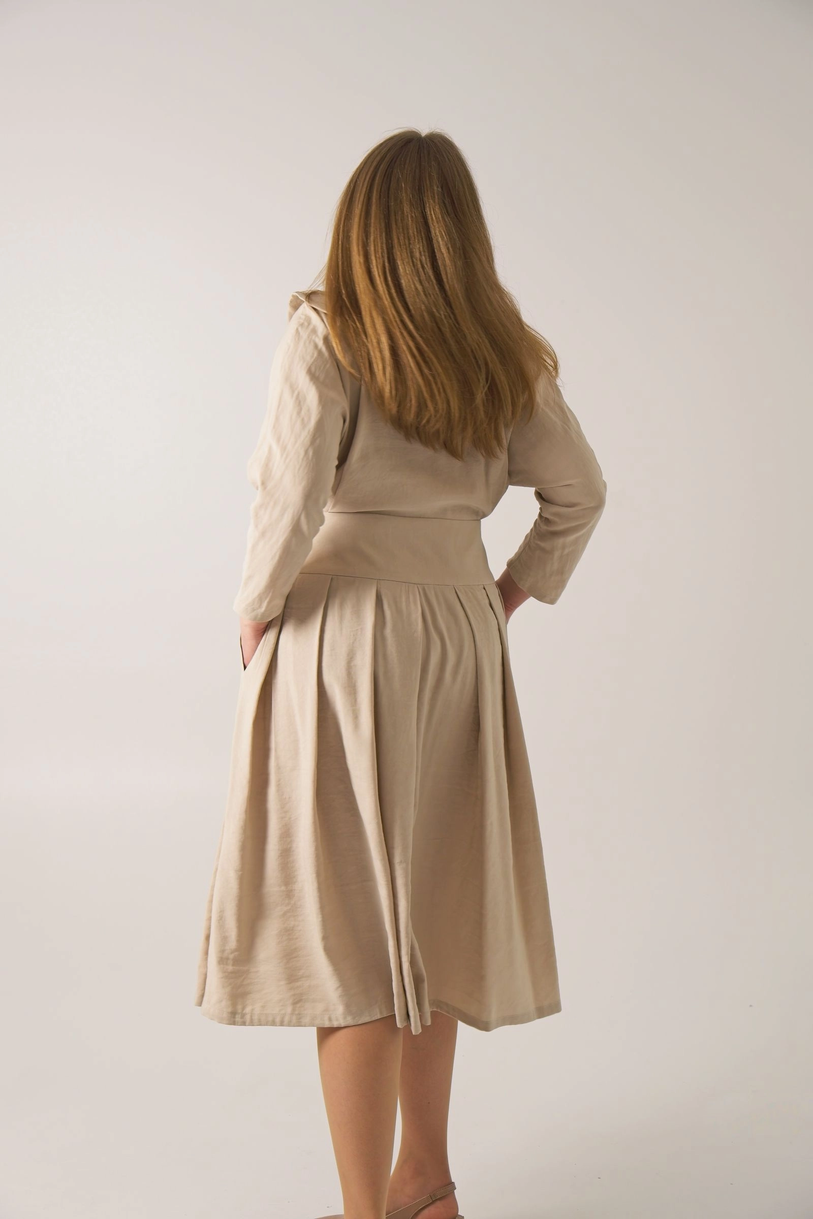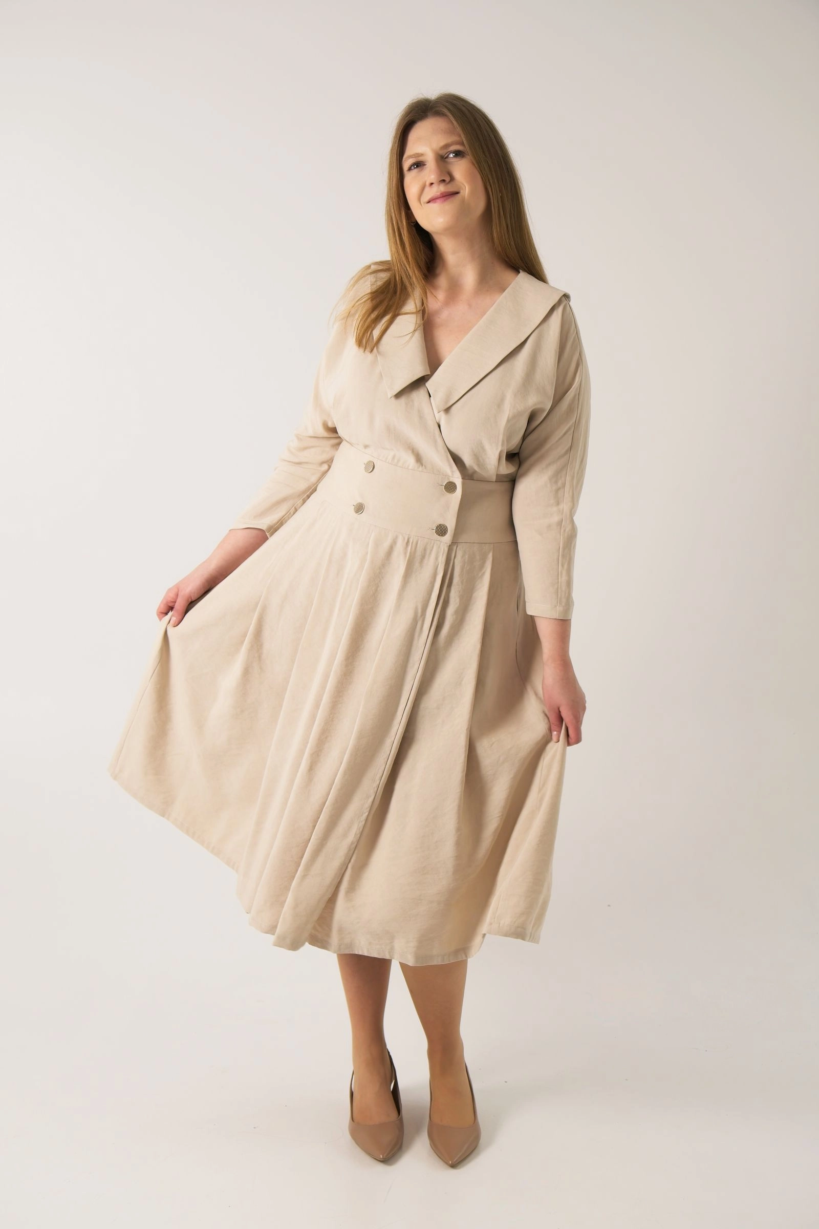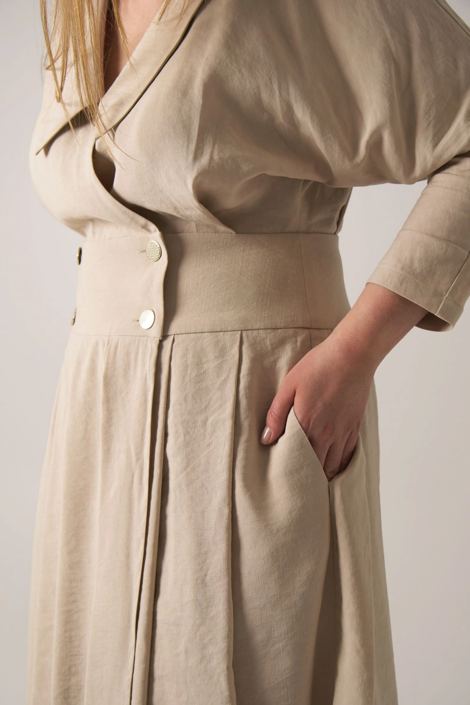 Naturalna mieszanka lnu i wiskozy zapewnia przewiewność i miękkość w noszeniu. Fason łączy dopracowaną górę z bardziej swobodnym dołem, dzięki czemu sukienka zachowuje elegancki charakter, a jednocześnie nie ogranicza ruchów.