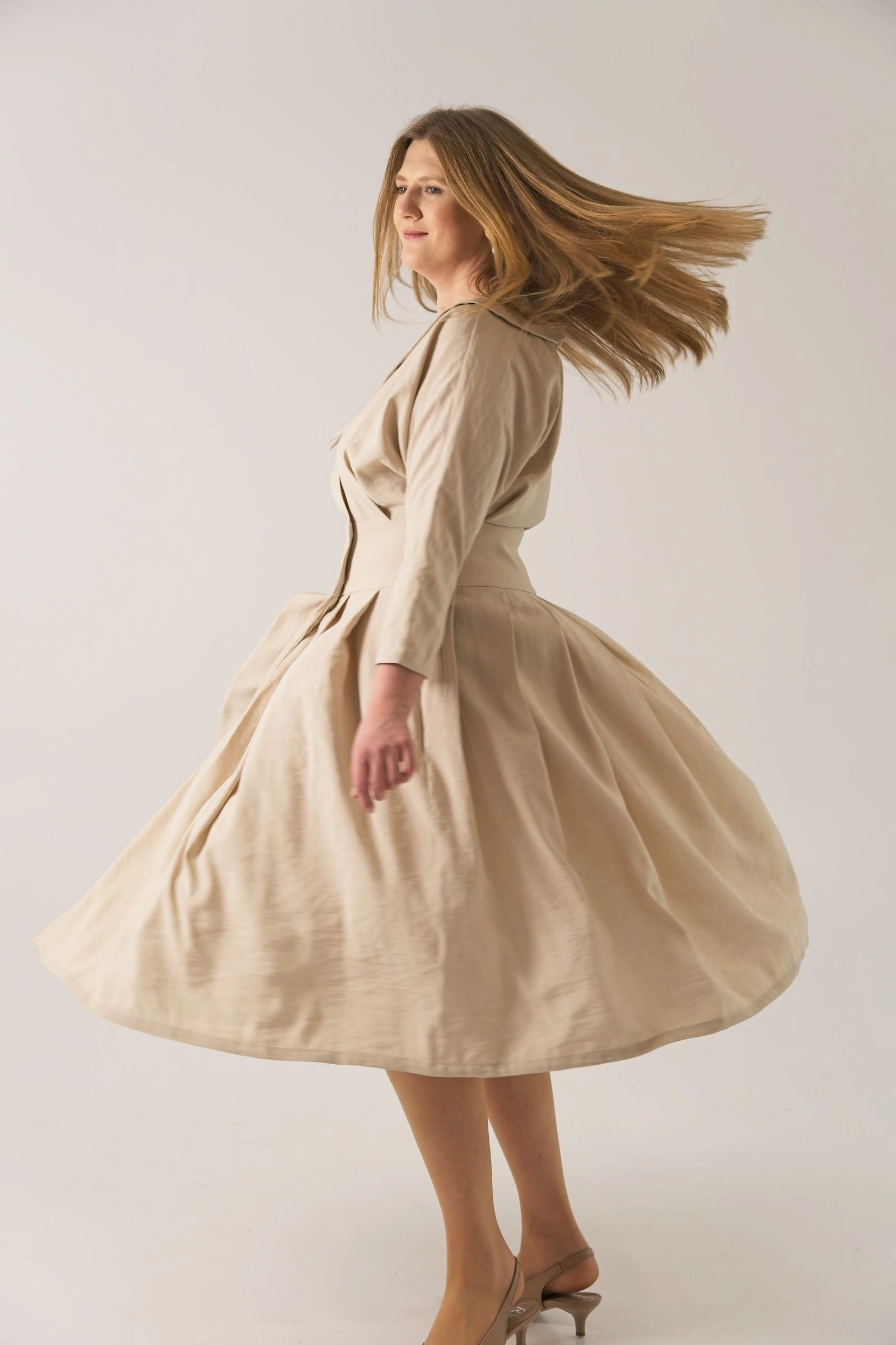 Tkanina miękko układa się na ciele i dobrze pracuje w ruchu. Góra zachowuje bardziej uporządkowaną formę, a rozkloszowany dół wprowadza lekkość i swobodę, dzięki czemu całość wygląda spójnie i naturalnie.
